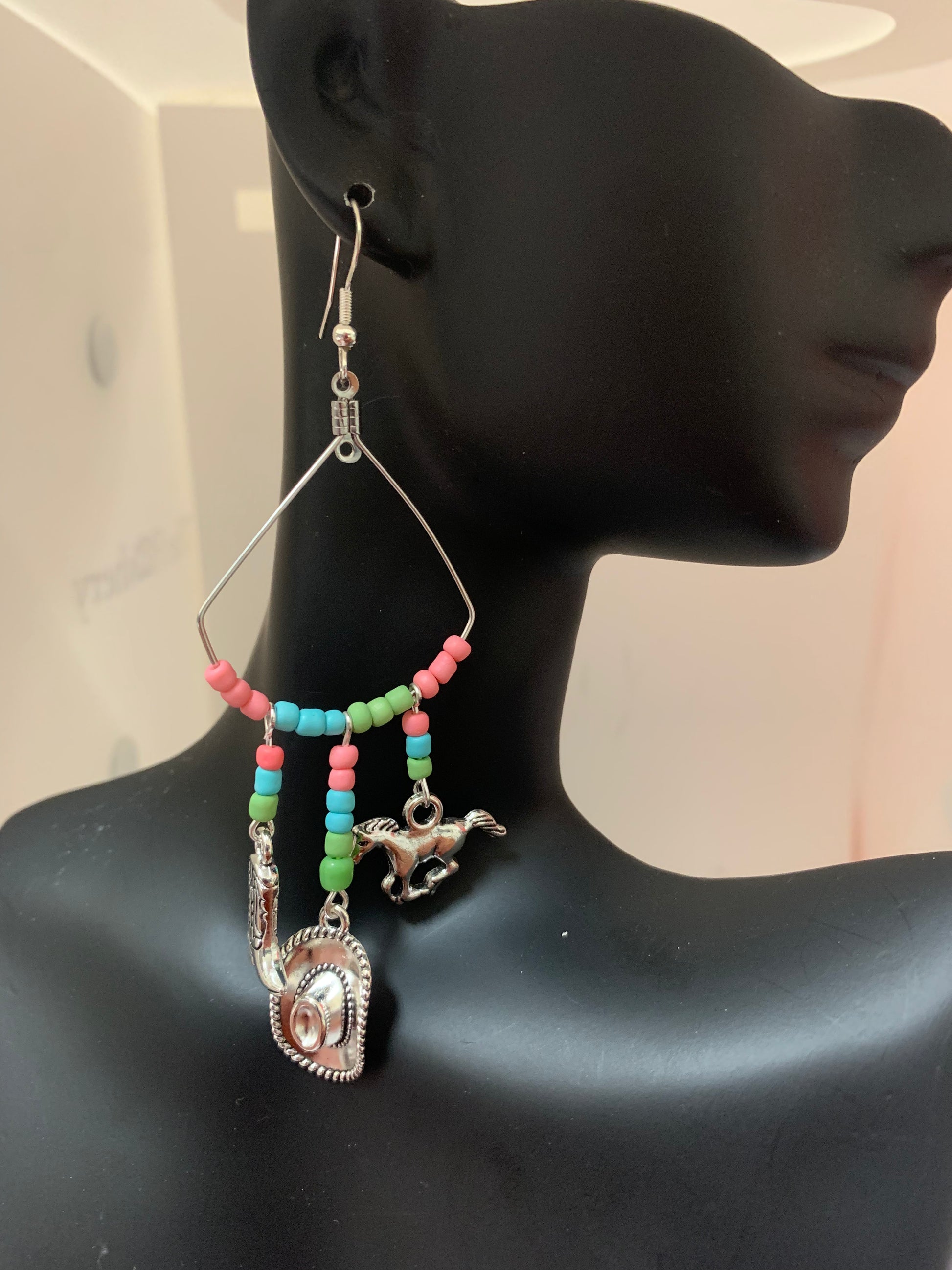 A perfect combination, Hat, boot and horse arranged with southwestern beads. Hook backing can be changed to clip, lobster, claw, post.